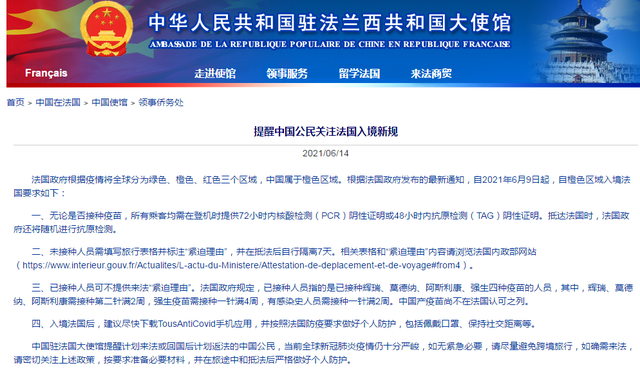 中国驻法国大使馆提醒计划来法或回国后计划返法的中国公民,当前全球新冠肺炎疫情仍十分严峻,如无紧急必要,请尽量避免跨境旅行,如确需来法,请密切关注上述政策,按要求准备必要材料,并在旅途中和抵法后严格做好个人防护。