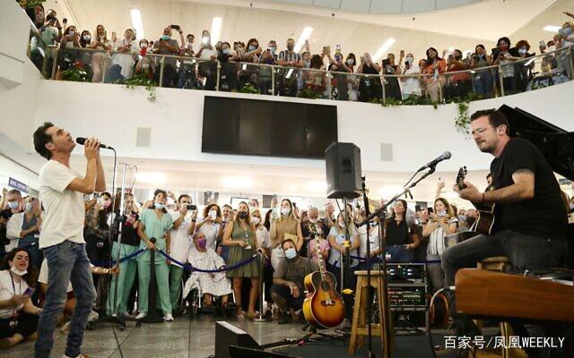 2021年6月1日,音乐家在特拉维夫的一家医院表演,庆祝疫情限制措施基本取消