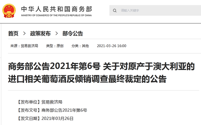 今年3月26日,我国商务部公布对澳产葡萄酒反倾销调查的最终裁定,即原产于澳大利亚的进口相关葡萄酒存在倾销,国内相关葡萄酒产业受到实质损害,而且倾销与实质损害之间存在因果关系。