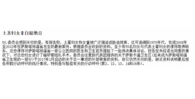 2018年,联合国禁止酷刑委员会曾经通过关于加拿大第七次定期报告的结论性意见,对加原住民妇女和女童被广泛强迫或胁迫绝育表达关切。这份意见书提到,有报告称,加国的土著妇女和女童被广泛强迫或胁迫绝育,这可追溯到1970年代,还包括2008年至2012年在萨斯喀彻温省发生的最新案件。