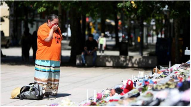 当地民众在坎卢普斯市寄宿学校旧址摆放童鞋,以悼念这些遭遇不幸的原住民儿童。图为一名市民在这些童鞋前哭泣。图源:Getty Images