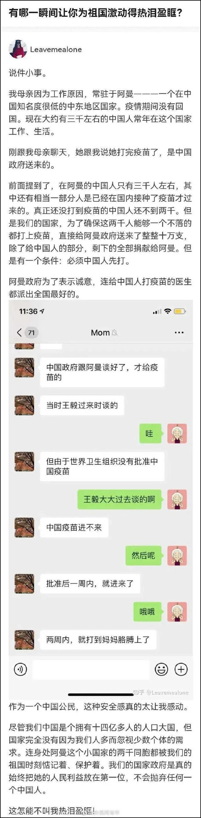6月20日,有网友分享了母亲在阿曼接种中国疫苗的故事,动情地说:“我们的国家政府是真的把她的人民利益放在第一位,不会抛弃任何一个中国人。”