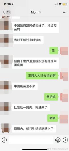 刚跟我母亲聊天,她跟我说她打完疫苗了,是中国政府送来的。