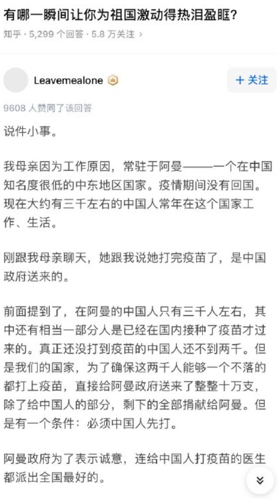 这个帖子回答的提问是:“有哪一瞬间让你为祖国激动得热泪盈眶?”名为“Leavemealone”的网友的一则回答获得了近万点赞。