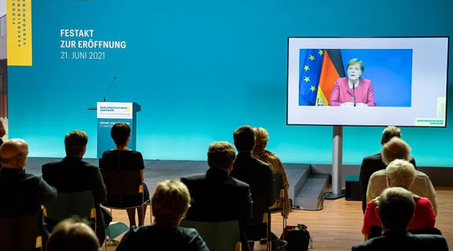 当地时间21日,新的逃亡、驱逐、和解基金会档案中心在柏林正式揭幕,德国总理默克尔通过视频连线方式出席仪式并发表讲话。