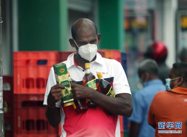 6月21日,一名男子抱着刚买到的物资走在斯里兰卡科伦坡街头。