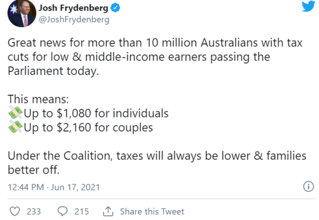 财长Josh Frydneberg称,这对1000多万澳人来说是个好消息,个人将获得高达1080澳元减税,伴侣将获得高达2160澳元减税。