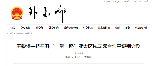 国务委员兼外长王毅将于6月23日主持“一带一路”亚太区域国际合作高级别会议。会议将以视频形式举行,主题为“加强抗疫合作、促进经济复苏”。亚洲和太平洋地区有关国家的外长或经济部长及联合国等国际组织代表共30多方将与会。