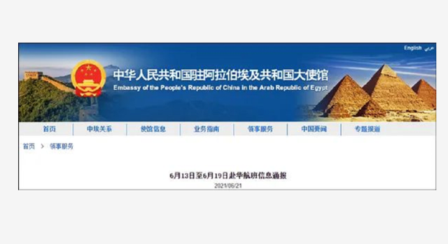 6月21日,中国驻埃及大使馆网站通报6月13日至6月19日赴华航班信息,发现2架次航班108人检测阳性。