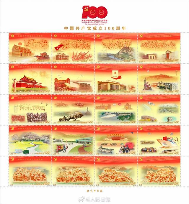■ 中国邮政将于7月1日发行《中国共产党成立100周年》纪念邮票1套20枚,纪念封1套1枚。