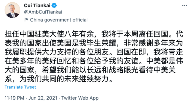 中国驻美大使崔天凯22日在网络社交媒体上发文说,“担任中国驻美大使八年有余,我将于本周离任回国。代表我的国家出使美国是我毕生荣耀,非常感谢多年来为我履职提供大力支持的各位朋友。回国在即,我将带走在美多年的美好回忆和各位给予我的友谊。中美都是伟大的国家,希望我们能以长远和战略眼光看待中美关系,为我们共同的未来继续努力。”