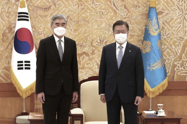 韩国总统文在寅(右)22日在青瓦台接见到访的美国朝鲜问题特别代表金圣(美联社)