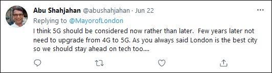 在吐槽的同时,也有网民认真地给市长萨迪克·汗提出了建议:“我认为应该现在而不是以后再考虑5G,这样数年后就不用从4G升级到5G了。正如你总说的那样,伦敦是最棒的城市,所以我们也应该在技术上保持领先。。。。。。”