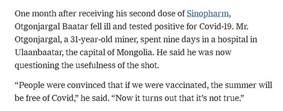 同时,她对于巴林、智利、蒙古这三个同样被她用来“印证”中国疫苗“无效”的国家的描述,也存在着一模一样的问题,不顾这些国家感染了什么变异毒株、公共卫生防控措施如何,人口素质如何等因素,而急着就把这些国家的疫情复燃怪给了中国疫苗的“无效”上。