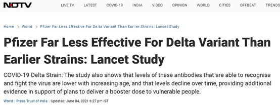 更打脸的是,根据印度媒体的报道,发布在知名学术刊物《柳叶刀》上的一项研究发现,即便是黄瑞黎视为 “最有效”的BNT疫苗,在面对最先在印度出现的德尔塔变种毒株时,也存在着有效性大大下降的情况。