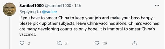 有人就写到:如果你们要抹黑中国,能不能别碰疫苗这个话题,因为对于很多发展中国家来说,中国疫苗是唯一的希望。