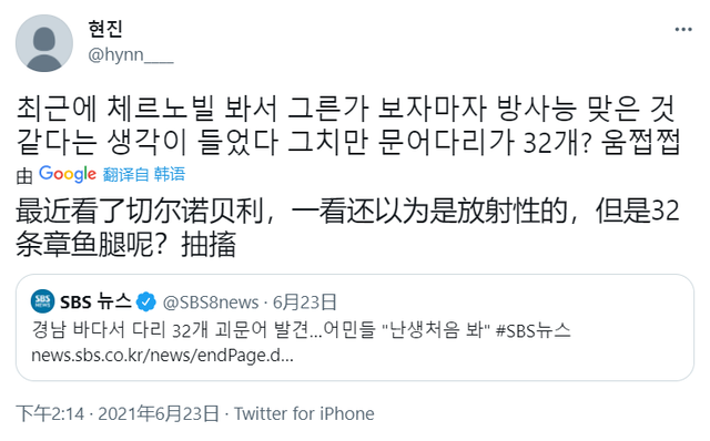 然而,由于韩国渔民捕获这只32足章鱼的时机实在太过凑巧,因此有不少韩国民众都下意识地将它和福岛核污水联系了起来,认定这只章鱼是受到了核辐射毒害才诞生的怪物。