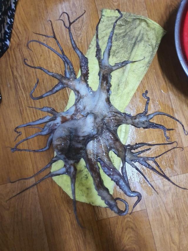 报道称,目前韩国正处于章鱼禁渔期,韩国渔民本想将这位不速之客一放了之。但由于它的长相实在过于别致,因此忍不住多打量了几眼。这一端详才发现,这只章鱼的触足犹如树根一样盘根错节,“大腿”上还长着“小腿”,数量总共有32条之多。