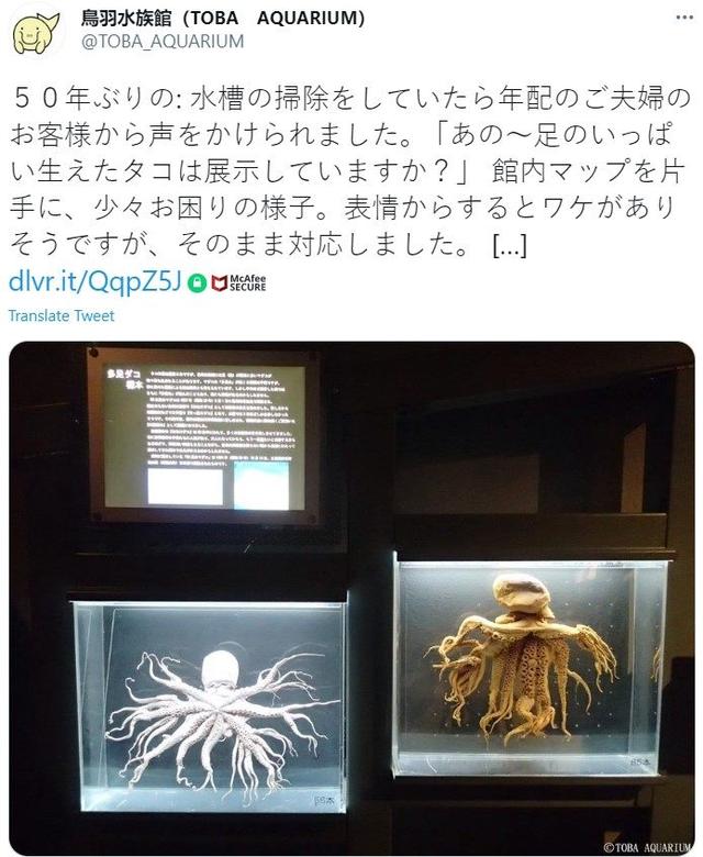志摩水族馆并不是日本唯一一个能看到多足章鱼标本的地方,鸟羽水族馆同样也存放着两个多足章鱼标本,一个长着85条腿,于1957年在鸟羽市东志岛附近海域被捕获;一个长着56条腿,于1964年在北室县海山町附近海域被捕获。