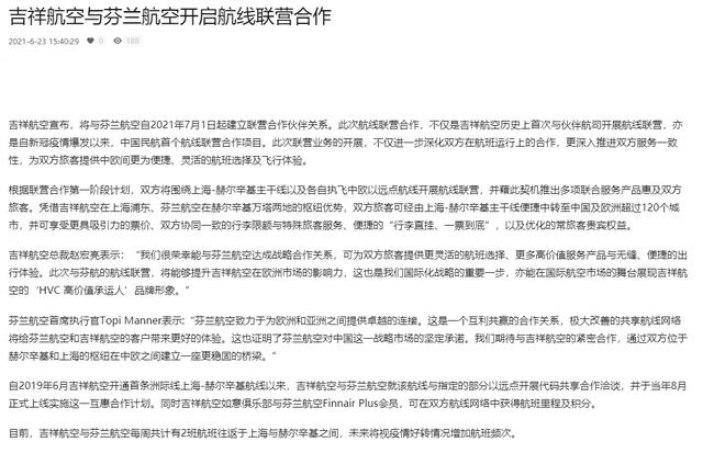 2.《[爱飞乐游]吉祥航空宣布,和芬兰航空从7月1日开始建立起联营合作伙伴关系》仅供读者参考,本网站未对该内容进行证实,对其原创性、真实性、完整性、及时性不作任何保证。