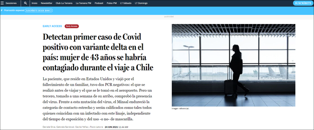 智利首例德尔塔病例:据报道,一名43岁的妇女在前往智利途中感染了该病毒(智利媒体报道截图)