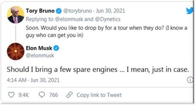 不仅如此,马斯克还“隔山打牛”对蓝色起源发出嘲讽。此前,美国联合发射联盟(ULA)的CEO托瑞·布鲁诺表示,ULA下一代火神火箭中安装蓝色起源的可重复使用发动机,将使其在2021年底首次发射名为“隼鸟”(Peregrine)的月球着陆器。近日,马斯克就暗搓搓地跟布鲁诺说了:“要不要我带一些多余的引擎……我的意思是,以防万一。”
