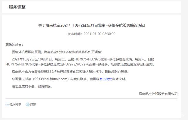 除此之外,小乐再“附赠”一个加拿大航线调整提醒:由海南航空执飞的、原定于10月2日-31日每周二三运营的HU7975/7976(北京=多伦多)航班取消;该航班每周六、日的班次从“北京=多伦多”改为“西安=多伦多”。