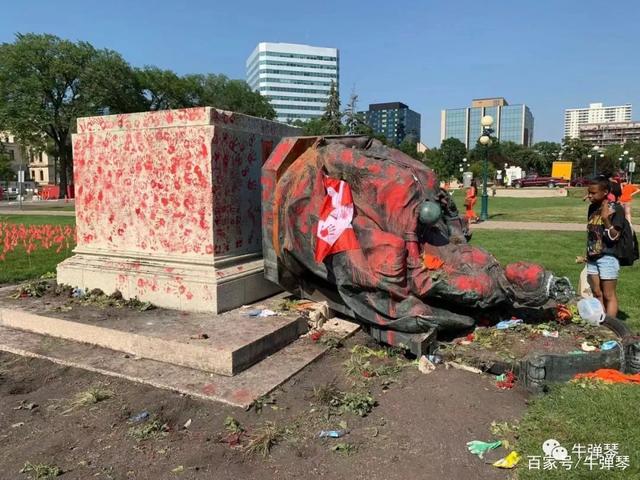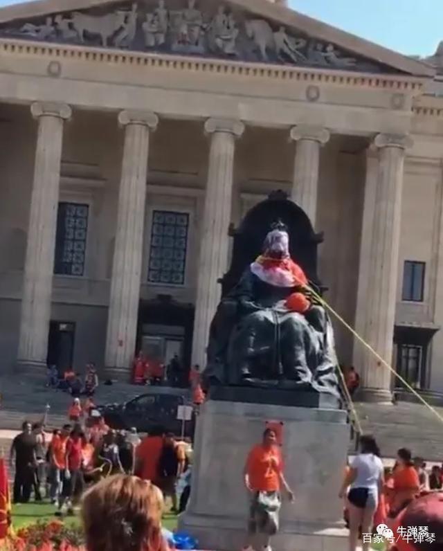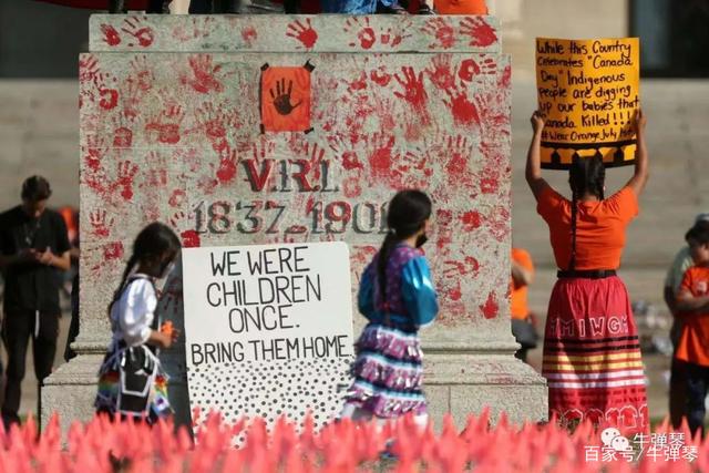 其中,就包括英国维多利亚女王的塑像。人们找来绳索,套上她的脖子,将她拉倒。女王塑像底座,则是一个又一个的红色印,还有,“我们曾经是孩子,带他们回家”的牌子。