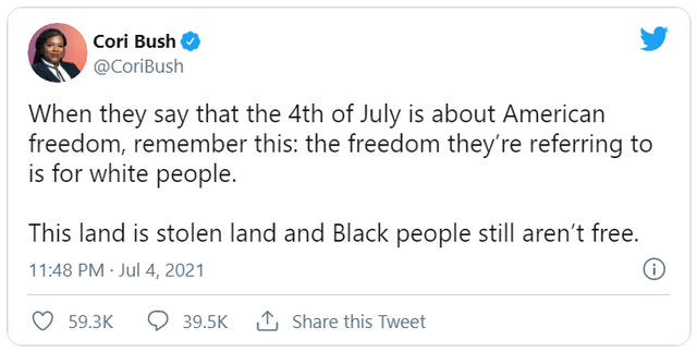 沃特斯的这番言论,出自其主持的一档视频访谈节目中。事情的起因,是美国国会议员、黑人社会活动家克里·布什在美国独立日当天发布了一条推文,称“这天所代表的美国自由,是属于白人的”,并称“美国的土地是从原住民那偷来的,美国黑人还没有赢得自由”。