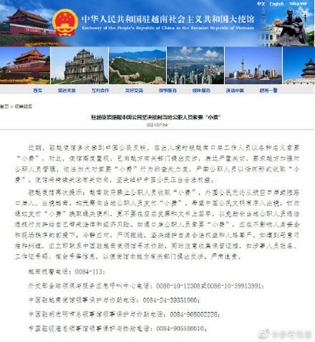 (原标题:中国公民出入境被索小费 中国驻越使馆:提出交涉,严重关切)