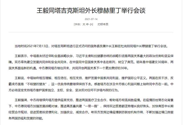 王毅强调,中方将继续向塔方提供疫苗支持,推进两国医疗卫生合作,帮助塔方彻底战胜疫情。在疫情防控常态化背景下,中方愿同塔方加强发展战略对接,推进高质量共建“一带一路”,保持双边贸易额逆势增长良好势头,加快商签中长期经贸合作规划,促进贸易投资便利化,加强农业、减贫合作。希双方发挥边境疫情联防联控机制作用,不断加强边境口岸服务两国防疫和发展的效能。