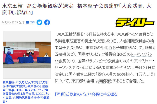 要知道,日本政府和奥组委在一年前宣称的“以完美形式呈现奥运”,基本上已经化为泡影,据野村综合研究所的木内登英计算,如果空场举办奥运会,那么门票收入会损失,有关的消费也会减少,经济损失将达1468亿日元。在宣布东京都内的所有赛事以无观众方式举行之后,组委会女高官桥本圣子也向所有购票者正式致歉,心酸又无奈。