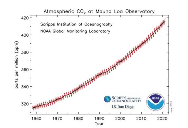 然而,似乎如今我们并没有看到全球变暖的停止,温室气体排放的减少,而是在不断升级之中,2021年5月的温室气体——二氧化碳的排放又创下了历史性的新高。今年5月,大气中二氧化碳浓度爬升到近419ppm,这种二氧化碳的堆积与400多万年前的情况相当,所以非常严峻,不能持续下去了。