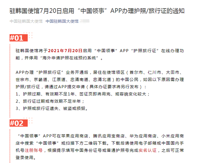 日前,中国驻韩国大使馆发布关于7月20日启用“中国领事”APP办理护照/旅行证的通知。