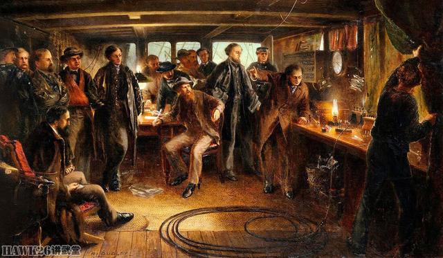 英国艺术家罗伯特·达德利(Robert Dudley)创作的油画,再现了“大东方(Great Eastern)”号客舱内,检查跨大西洋海底电缆的情景。