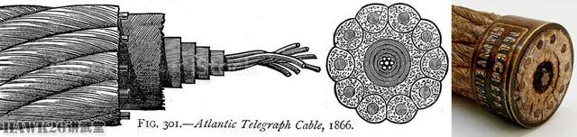 1866年使用的电缆结构,中央是被几层橡胶包裹的铜芯,外层是黄麻缆绳。