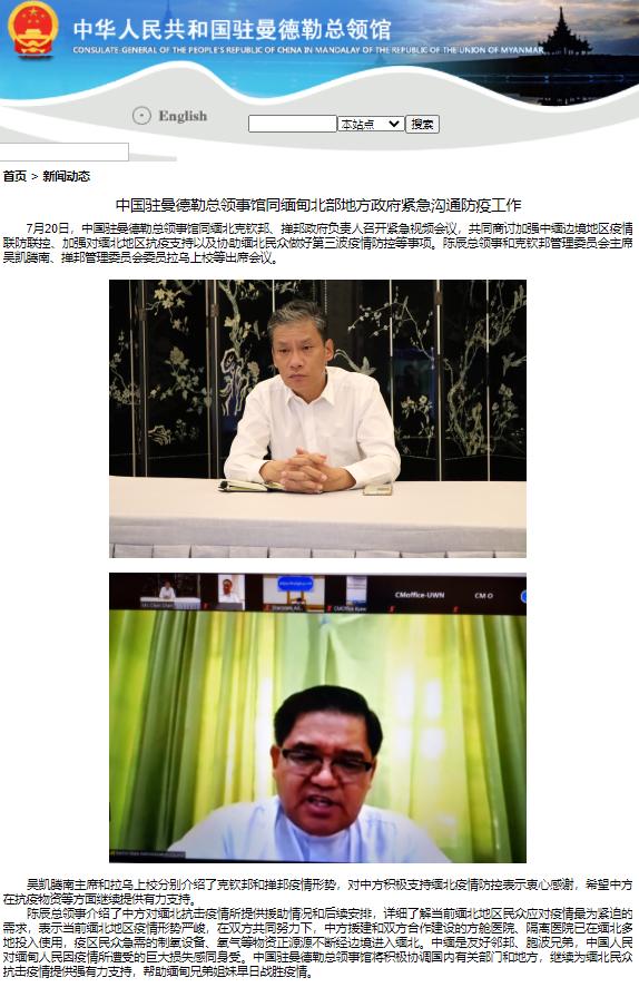 中国驻曼德勒总领馆网站消息,7月20日,中国驻曼德勒总领事馆同缅北克钦邦、掸邦政府负责人召开紧急视频会议,共同商讨加强中缅边境地区疫情联防联控、加强对缅北地区抗疫支持以及协助缅北民众做好第三波疫情防控等事项。陈辰总领事和克钦邦管理委员会主席吴凯腾南、掸邦管理委员会委员拉乌上校等出席会议。