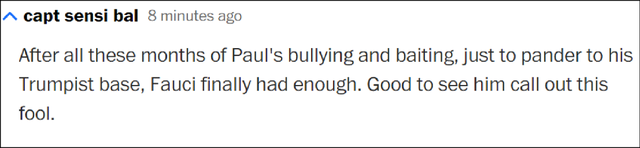 “这几个月来,保罗一直在欺凌和诱骗福奇,这全是都为了去迎合他的那些特朗普粉丝。福奇终于受够了,很高兴看到福奇揭露他愚蠢的一面。”