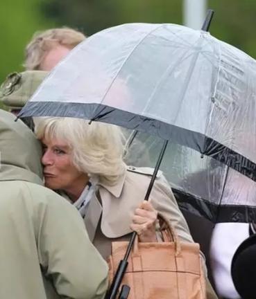 卡米拉又对女王行贴面礼,不过伞是不是应该给女王打一下呢?