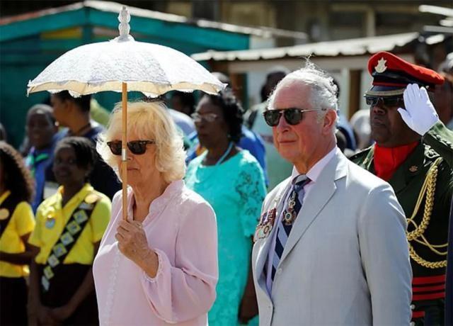 看这把伞,烈日下卡米拉打了个巴掌大的小伞,而查尔斯只能独自晒着了。