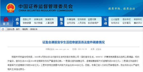 2020年4月,宜华生活公告称,公司于4月24日收到中国证监会《调查通知书》,公司因涉嫌信息披露违法违规遭到立案调查。在经过近半年的调查后,2021年1月,证监会在新闻发布会上通报*ST宜生(宜华生活)信息披露违法案件调查情况。