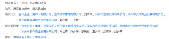 与此次8.13亿元估值资产拍卖相关执行案——(2020)浙01执965号案件的案情,目前暂未公开,具体详情不得而知。不过,被执行人——宜华企业(集团)有限公司、汕头市宜鸿投资有限公司等5家企业,以及刘绍喜等6位自然人,已被杭州中院出具了限制消费令。