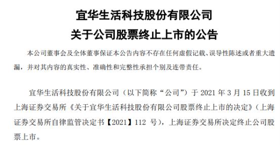 但是,自宜华生活2020年4月被调查以来,宜华生活的股价一路下挫,今年2月22日,连续20个交易日低于1元面值的宜华生活,触发"面值退市"标准,并于3月22日作别A股市场。