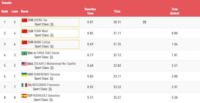 9月1日,在东京残奥会游泳男子50米自由泳S5级决赛中,三名中国选手发挥出色,郑涛游出30秒31,打破残奥会纪录,夺得金牌!袁伟译、王李超分获二、三名,中国代表团包揽该项目金银铜牌!