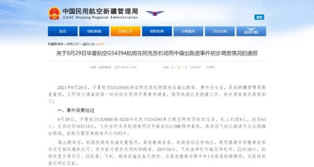 2021年8月29日,华夏航空G54394航班在阿克苏机场落地后偏出跑道。事件发生后,民航新疆管理局高度重视,立即成立调查组第一时间赶赴现场开展事件调查,指导机场应急救援工作。初步调查情况通报如下: