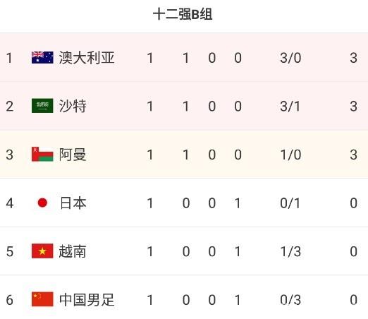 世预赛亚洲区12强赛结束首轮争夺,在B组的比赛中,阿曼1-0力克亚洲第一日本队,爆出本轮比赛的最大冷门。亚洲排名第6的沙特3-1逆转越南,拒绝了又一场冷门的产生。国足0-3完败于澳大利亚脚下,暂时排在小组垫底的位置。