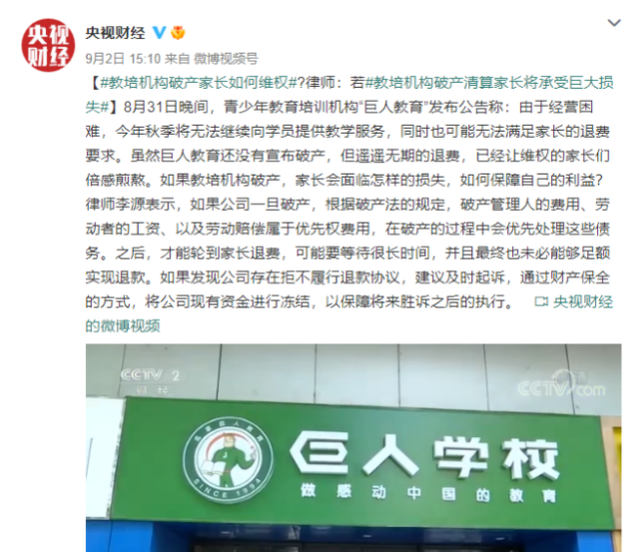 8月31日晚间,青少年教育培训机构“巨人教育”发布公告称:由于经营困难,今年秋季将无法继续向学员提供教学服务,同时也可能无法满足家长的退费要求。虽然巨人教育还没有宣布破产,但遥遥无期的退费,已经让维权的家长们倍感煎熬。如果教培机构破产,家长会面临怎样的损失,如何保障自己的利益?律师李源表示,如果公司一旦破产,根据破产法的规定,破产管理人的费用、劳动者的工资、以及劳动赔偿属于优先权费用,在破产的过程中会优先处理这些债务。之后,才能轮到家长退费,可能要等待很长时间,并且最终也未必能够足额实现退款。如果发现公司存在拒不履行退款协议,建议及时起诉,通过财产保全的方式,将公司现有资金进行冻结,以保障将来胜诉之后的执行。