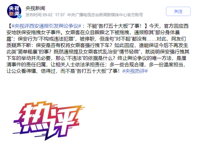 中宏网9月3日电 昨天晚上,西安有关各方面通报了对地铁保安人员拖拽女子事件的调查结论。但是这一结论公众并不接受,央视热评认为,官方回应有“和稀泥”的嫌疑,公众看到的事实是女子被地铁保安人员强行拖拽出地铁车厢,在这个过程中,女子的衣服被扯坏,衣不蔽体,对于一个女性而言,在光天化日、众目睽睽之下,出现这样尴尬的事情,是无法接受的。而通报仅称“女子部分身体暴露”;保安行为“不构成违法犯罪”,被停职;地铁运营方面未能加强对安保人员的培训教育义务。而整个过程中缺乏对人最起码的尊重,央视评论中提出,“连一句‘对不起’都没有。”