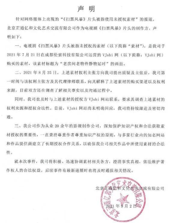 9月2日,负责制作片头的北京正通亿和文化艺术交流有限公司发表声明称,这段素材是7月21日购买于另一个素材网站VJshi,已及时联系并要求VJshi网站调查素材的权利来源和授权合法性,但对方尚未明确回应。