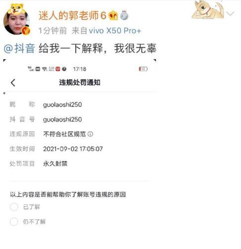 9月2日,@迷人的郭老师6在新浪微博平台要求抖音解释永久封禁的违规处罚。